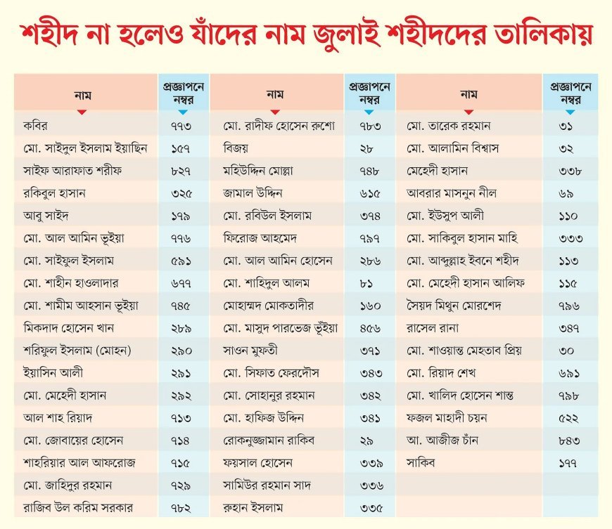 এদিকে গণ-অভ্যুত্থানে শহীদ হওয়ার ঘটনায় মামলা হয়েছে, অথচ প্রজ্ঞাপনে নাম ওঠেনি এমন সাতজনের তথ্য পেয়েছে পুলিশ ব্যুরো অব ইনভেস্টিগেশন (পিবিআই)। এই সাতজনের মধ্যে পাঁচজনের পরিবারের সঙ্গে কথা বলেছে । তাঁদের প্রত্যেকেই দাবি করেছেন, এই ব্যক্তিরা গণ-অভ্যুত্থানে শহীদ হয়েছেন।