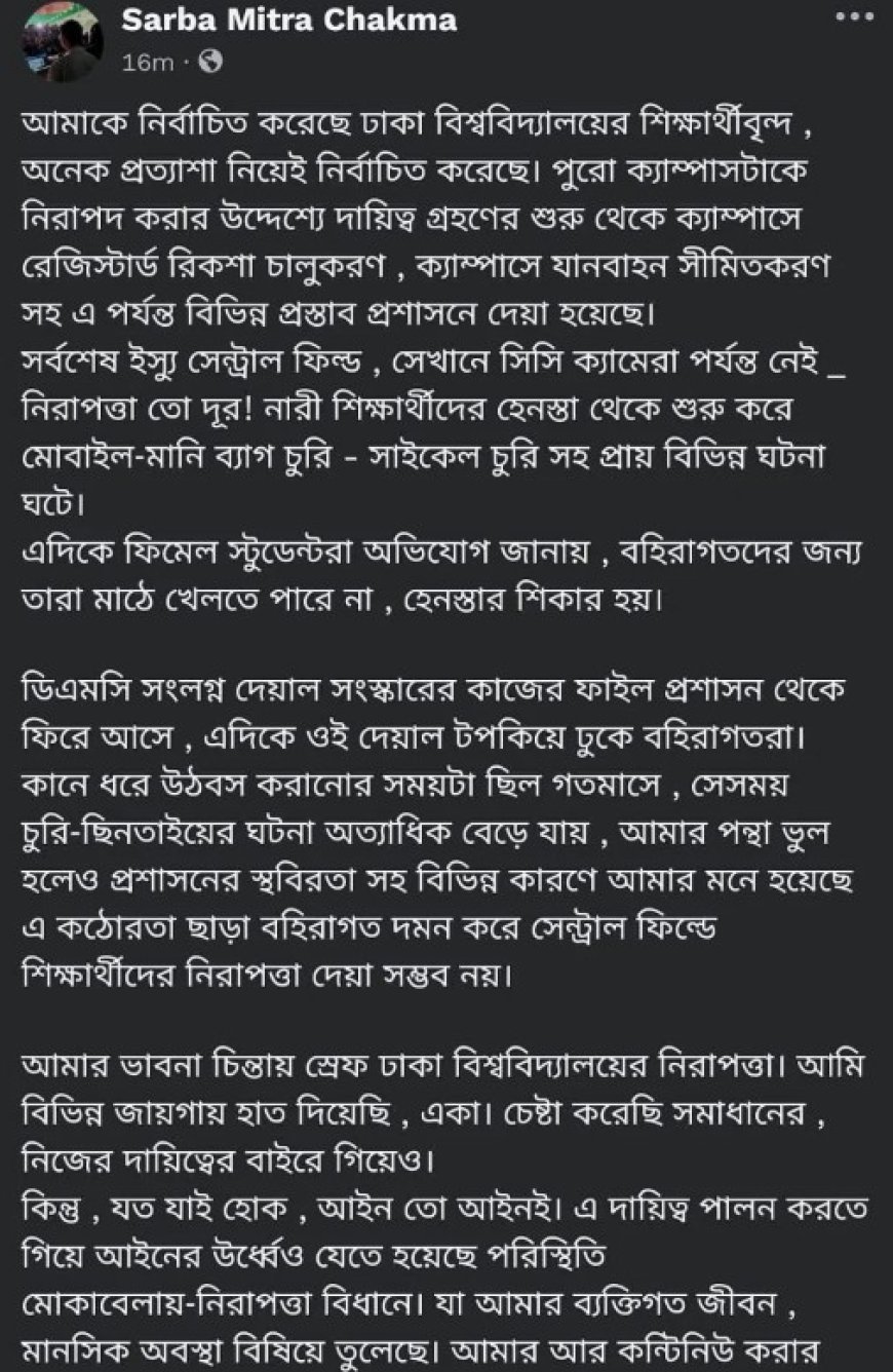 সোমবার দুপুরে নিজের ভেরিফায়েড ফেসবুক পেজে দেওয়া এক পোস্টে সর্বমিত্র চাকমা পদত্যাগের বিষয়টি নিশ্চিত করেন। তিনি ইসলামী ছাত্র শিবির প্যানেল থেকে ডাকসু নির্বাচনে জয়ী হয়ে কার্যনির্বাহী সদস্য নির্বাচিত হন।