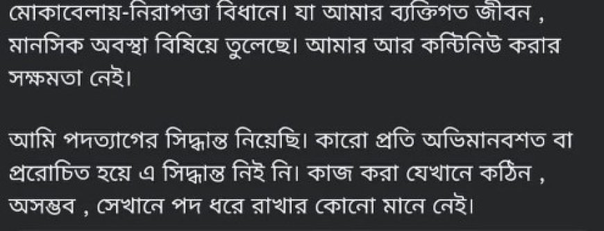 পদত্যাগ প্রসঙ্গে তিনি লেখেন, এটি তার ব্যক্তিগত সিদ্ধান্ত এবং কারও প্রতি ক্ষোভ বা অভিমান থেকে নয়। তিনি মনে করেন, শিক্ষার্থীরা যে প্রত্যাশা নিয়ে তাকে প্রতিনিধি হিসেবে বেছে নিয়েছিলেন, তিনি তা পূরণ করতে পারেননি। প্রশাসনের অসহযোগিতা ও ব্যর্থতার দায় মাথায় নিয়েই তিনি ডাকসুর কার্যনির্বাহী সদস্য পদ থেকে সরে দাঁড়ানোর সিদ্ধান্ত নিয়েছেন।