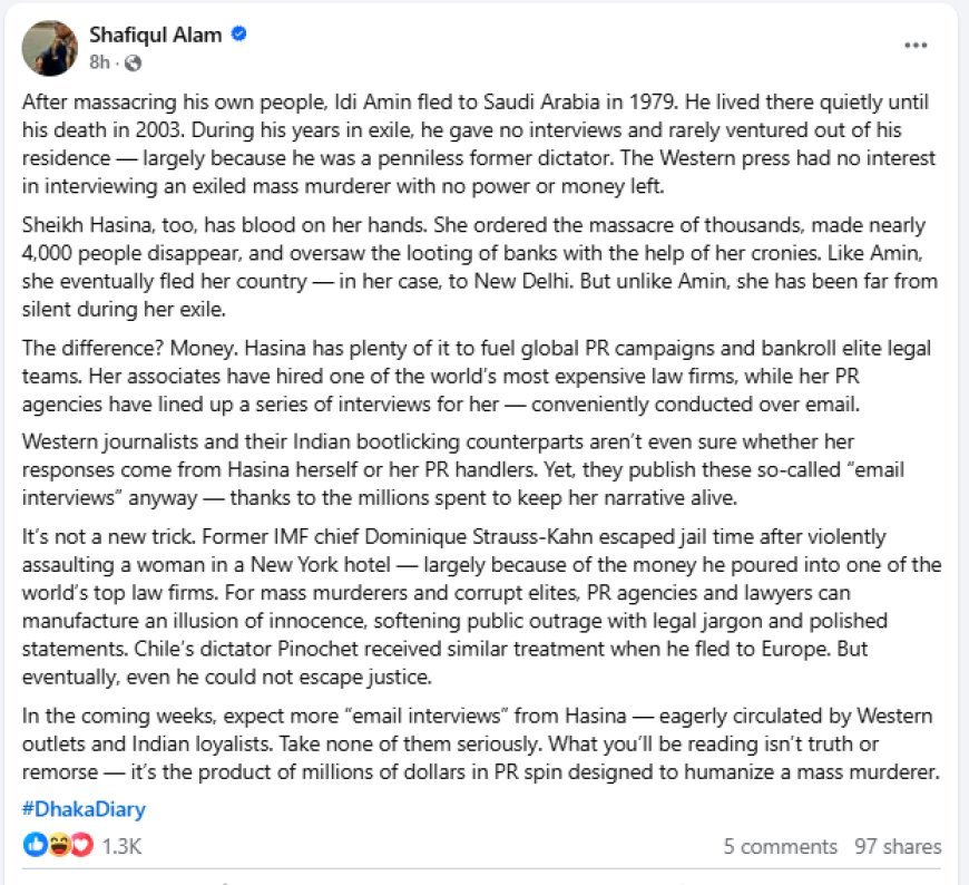 বাংলাদেশ সরকারের প্রধান উপদেষ্টার দপ্তরের মুখপাত্র শফিকুল আলমের সাম্প্রতিক বক্তব্যের তীব্র নিন্দা জানিয়েছে প্রেস ক্লাব অব ইন্ডিয়া। ১১ নভেম্বর ২০২৫ তারিখে দেওয়া একটি ফেসবুক পোস্টে শফিকুল আলম সম্প্রতি ভারতের বিভিন্ন গণমাধ্যম ও আন্তর্জাতিক সংবাদমাধ্যমের যেসব সাংবাদিক সাবেক প্রধানমন্ত্রী শেখ হাসিনার সাক্ষাৎকার নিয়েছেন, তাদেরকে “পাশ্চাত্যের সাংবাদিক এবং তাদের ভারতীয় বুটলিকার সমতুল্য” বলে উল্লেখ করেন।