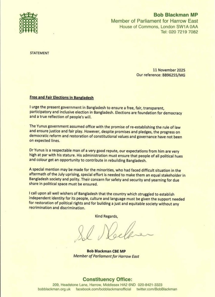 বাংলাদেশে অবাধ, সুষ্ঠু, স্বচ্ছ ও অংশগ্রহণমূলক নির্বাচন আয়োজনের আহ্বান জানিয়েছেন যুক্তরাজ্যের পার্লামেন্ট সদস্য (হ্যারো ইস্ট) বব ব্ল্যাকম্যান এমপি। তিনি বলেন, নির্বাচন হলো গণতন্ত্রের ভিত্তি এবং জনগণের ইচ্ছার প্রকৃত প্রতিফলন।